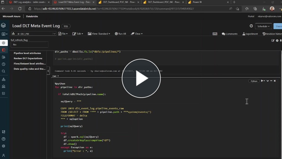 2. Next step is to hydrate metadata into data structures that you created in the first step. The demo below shows the script that can be scheduled based on the business requirements. It pulls the data from the JSON log files that are generated when a DLT pipeline run happens.